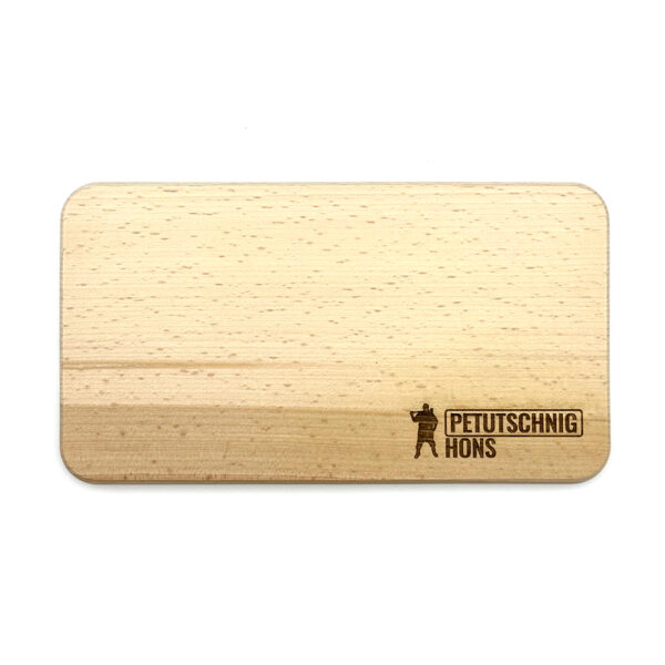 Frühstücksbrettchen aus unbehandelter und unverleimter Buche aus Europäischer Herstellung, mit graviertem Petutschnig Hons-Logo.